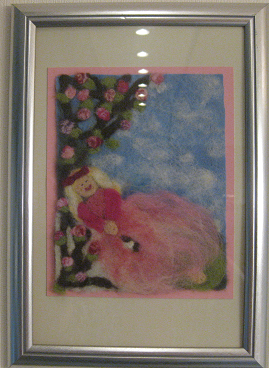 Hängt jetzt fertig und gerahmt an der Wand... und lässt sich schlecht knipsen, seufz. Ist natürlich nicht so traumschön wie die riesengroßen Märchenbilder aus Filz in der Praxis eines früheren Kinderarztes... aber jeder fängt klein an. Und es ist ja auch noch jede Menge Filz zum Üben da, lol.